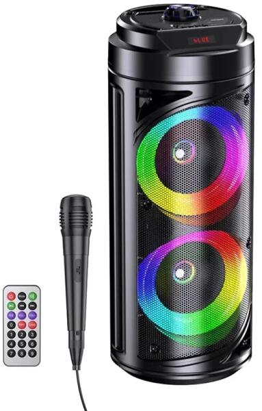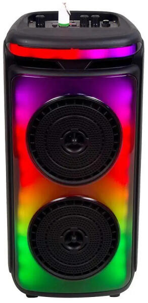 Soundor karaoke hangfalak Kapcsolható RGB világítással rendelkező, görgős, könnyen hordozható karaoke hangfalak, mikrofonnal. A készlet akkumulátort is tartalmaz, mellyel 2-4 óráig használható hálózati feszültség nélkül. Bluetooth, USB pendrive, SD kártya bemenet, távirányító. USB töltő a csomag része. Akkus - görgős karaoke hangszóró 2 db 6.5" Ki és bekapcsolhat