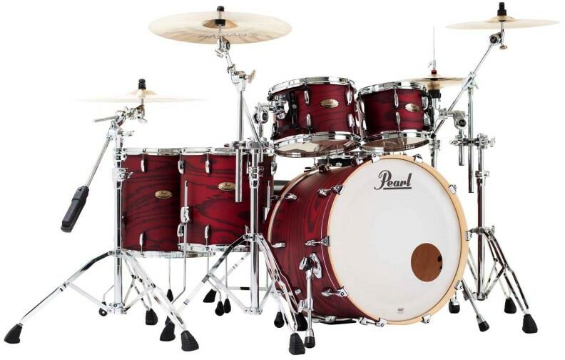 Pearl Session Studio Select Shell Pack - Méretek: 22"x16", 10"x7", 12"x8", 14"x14", 16"x16" Fúratlan nagydob Magasfényű lakkozás 6 rétegű 5.4 mm vastag birch-mahogany dobtestek Chrome-plated hardware 60° Shell bearing edge 2.3 mm SuperHoop II hoops Free-swinging Optimount tom suspension system Remo Taiwan Clear drum heads Colour: Scarlet Ash (# 847) pergődob, állványzat és cintányéro