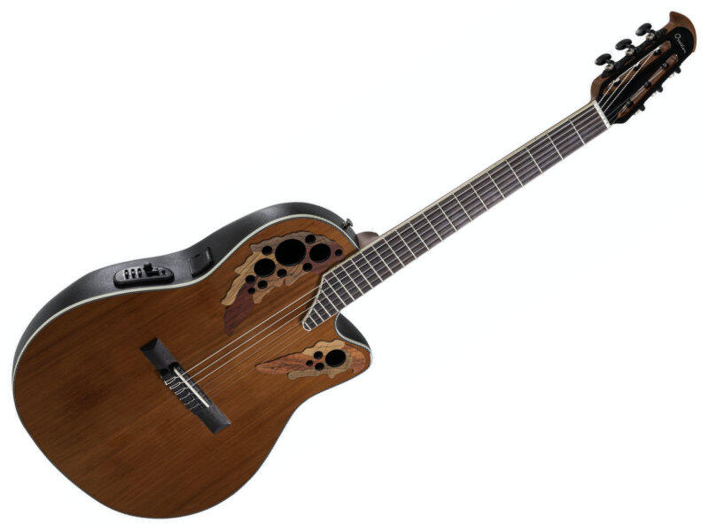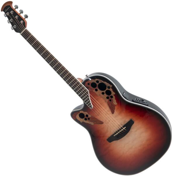 OVATION CE44LX-1R-G CELEBRITY ELITE PLUS MID CUTAWAY Balkezes Elektro-Akusztikus Gitár OV533.223 Válogatott nemes faanyag fedlap; scalloped, quartersawn X-Bracing Multi Soundhole Mid-depth Lyrachord® Body Natonyak, Ovangkol fogólap és hid Menzúra 643 mm, nyereg szélesség 42,8 mm Multi Hardwood Epauletten Abalone-Dot-Inlays Fekete szegély, abalone purfling Öntött Ovation-kulcsok, Chrom O