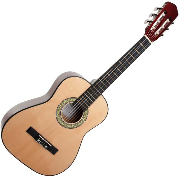 Klasszikus fa gitár 95 cm x 35 cmA 4/4-es méret felnőtteknek és gyermekeknek ajánlott 13 éves kortól és 1,66 m magasnak. - Méret: 4/4- Anyag: - acél. - Test: hársfa- Bronz foszforhúrok . 012–053. - A termékek tartalmazhatnak hiányos felületeket, amint az minden nem professzionális gitáron megtalálható, de amelyek nem befolyásolják a hangot
