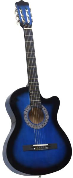 Kék árnyékos 6 húros klasszikus western cutaway gitár 38" Western cutaway gitárunk nagyszerű hangszer kezdőknek és amatőröknek. A gitár tömör hársból készült 6 húrral. A kiváló hangminőség és a gyönyörű kialakítás nagyon értékessé teszi a hangszert. A 63 cm-es menzúrával ellátott klasszikus gitár mindennel rendelkezik, amire egy gitárosnak szüksége lehet. Sz