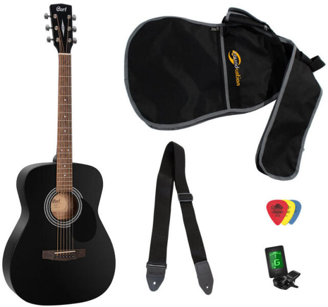 Akusztikus gitárszett. Cort AF510 gitár - mint az AD810 típus, csak nem dreadnought, hanem folk testtel, minimális formai különbséggel Előlap: ...