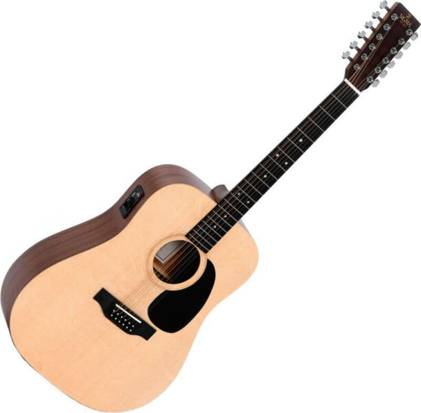 12-húros elektro-akusztikus gitár, tömör sitka fenyő fedlap, Sigma elektronika Test forma: Dreadnought - 14 Fret Fedlap: tömör Sitka fenyő Hát és oldal: Mahagóni Nyak: Mahagóni Fogólap: Micarta Pozíciójelölők: pötty Nyereg: csont Híd: Micarta Menzúra: 645 mm Nyak szélesség a nyeregnél: 47,6 mm Kulcsok: króm, zárt Lakkozás: PU lakkozás Binding a testszéleken: nincs Elekt