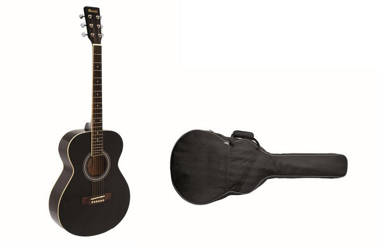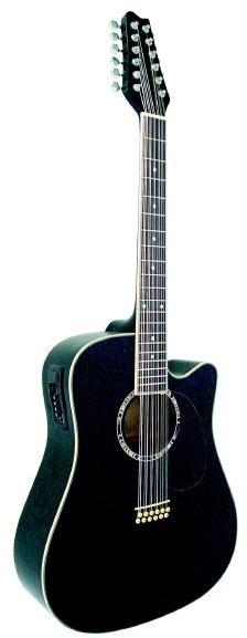 12 húros Western gitár Cutaway test Fedőlap: Hársfa Test: Hársfa Fekete koptató, pick guard Fogólap és híd Blackwood Celluloid berakások 20 bund Fényes polírozás Szín: fekete