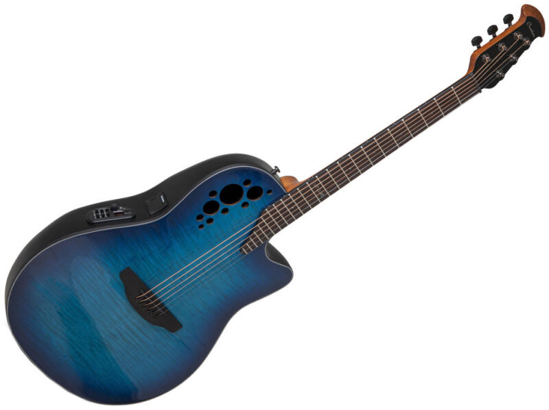 Kerekített műanyag hátú gitár Fedél: rétegelt lucfenyő Rozetta díszítő berakások Nyak: Mahagóni Cutaway test Celluloid berakások 3 sávos EQ hangszín 9 voltos elem Szín: Bordó Polírozott