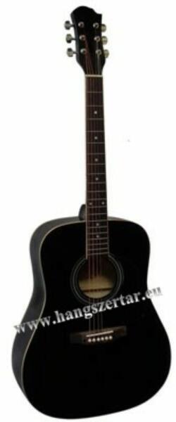 MSA fekete westerngitár -márkája MSA - kezdőknek és haladóknak is kiváló fémhúros gitár - fém csavarokkal - mérete 4/4 - hossza kb. 103 cm - gitártest hossza kb. 50 cm, szélessége kb. 40 cm, magassága kb. 11 cm - szélessége az 1. bundnál kb. 4,5 cm - 20 bund - heveder rögzítési lehetőség - fém húrokkal