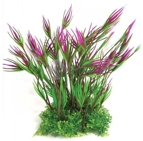 Hosszúszárú zöld és lila akváriumi műnövény, hegyes levelekkel, apró növényekkel a talpán. Mutatós, természetes hatású dísz. A dekorációs szerepe mellett a díszhalaknak is rejtekhelyet nyújt, ami nagyban növeli a komfortérzetüket. Élő növényekkel együtt is behelyezhető, remekül kiegészíti a látványvilágot. Talpa könnyen az aljzatba ásható, stabilan az akvár