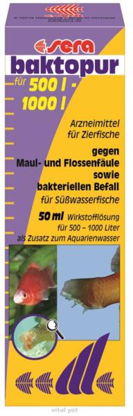 Termék részletekA sera baktopur megbízhatóan legyőzi a bakteriális megbetegedéseket, mint a száj-és uszonyrothadás és a szürkés fehér ill. vattaszerű helyeket a bőrön és az uszonyokon az akváriumok édesvízi halainál és a kerti tavakban. 50 ml 800-1000 literhez 100 ml 1600-2000 literhez 500 ml 8000-10000 literhez.