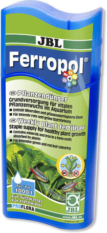 Termék részletek250ml JBL Ferropol Tápoldat akváriumi növények számára. Alapellátás az életképes növényzetért. Ásványi anyagokat és a növények számára hasznosítható vasat tartalmaz. Elősegíti a növények szaporodását. Élénk piros és zöld levélszínek. Elősegíti a növények növekedését és megoldja az algaproblémát.