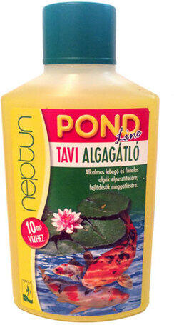 Termék részletek250ml Neptun Pond Blue tavi algagátló. Úgynevezett árnyékoló réteget képez a kerti tó vizének tetején, amely kiszűri az algák fotoszintéziséhez szükséges fényspektrumokat, így gátolva az algafélék szaporodását. A parti részeken, és a vízfelszínen a növények fejlődését nem gátolja