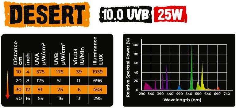 Termék részletekA REPTILE NOVA 10.0 DESERT egy magas UVB sugárzású fluoreszcens lámpa, amely a sztyeppék és félsivatagok fényviszonyait imitálja. Nagy intenzitású UVB-sugárzás, alkalmas a félszáraz területeken természetes környezetben előforduló, magas UV-igényű fajok számára. A magas UVB-tartalom hatékony D3-vitamin szintézist okoz, miközben elősegíti a kalcium felszívódását és