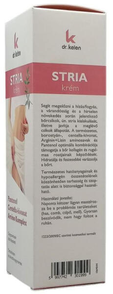 Segít megelőzni a hízás-fogyás, a várandósság és a hirtelen növekedés során jelentkező bőrcsíkok, ún. stria kialakulását, illetve javítja a meglévő csíkok állapotát. 100 ml-es krém; Dr. Kelen termék striák kezeléséhez.