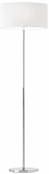 Modern stílusú álló lámpa, króm színű fém vázzal, fehér színű textil lámpaernyővel, vezetékre szerelt kapcsolóval.