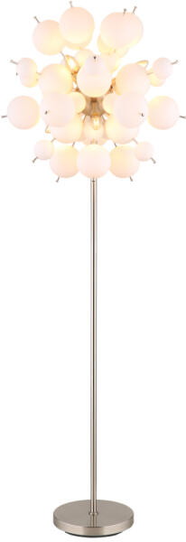 Állólámpa fém nikkel matt, fehér színű üveggömbök, fekete PVC kábel, lábpedálos kapcsoló a kábelen, ø: 550mm, M: 1550mm, kábel hossza 1800mm, üveggömbök átmérője: 24 x 6 cm, 24 x 10 cm, 6x E14 25W 230V izzók nélkül