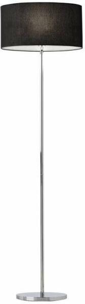 Modern stílusú álló lámpa, króm színű fém vázzal, fekete színű textil lámpaernyővel, vezetékre szerelt kapcsolóval.