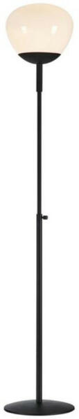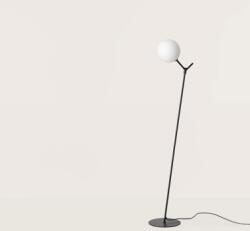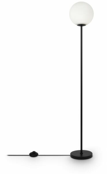 Fekete színű fém vázas álló lámpa gömb alakú (25cm átmérőjű) fagyasztott üveg búrával, E27-es foglalattal, vezetékre szerelt kapcsolóval. A lámpa fényforrást nem tartalmaz.
