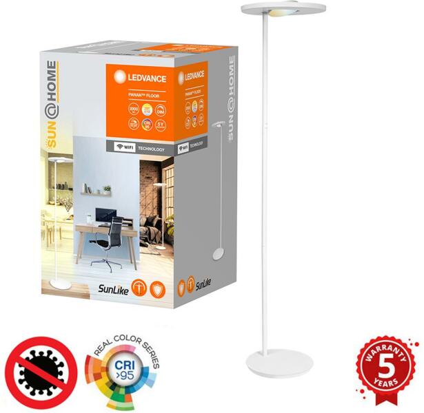 LED állólámpa a fényerősség és a fény színének beállításával. Színvisszaadási index: CRI 95. A SunLike LED javítja a napi éberséget, az aktivitási szintet, az optikai kényelmet, vagy az alvás intenzitását és ritmusát. A modern technológiának köszönhetően javítja otthona levegőminőségét, elpusztítja a baktériumokat és a kellemetlen port. Világítás színe: 2