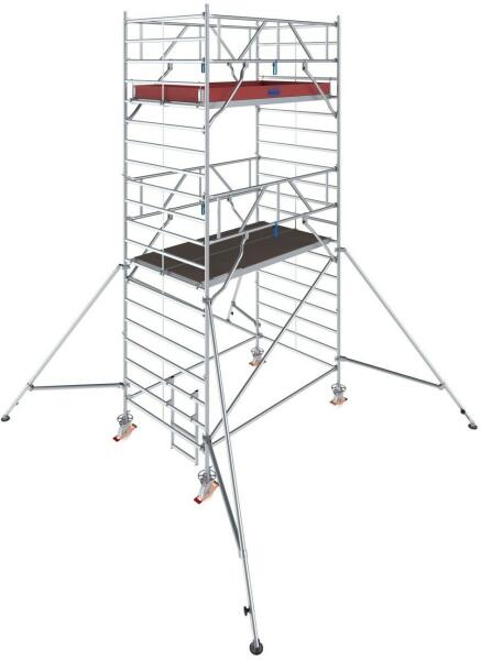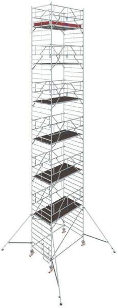 "TÜV minősítéssel, terhelhetősége 200 kg/m2 (3. állványcsoport) az EN 1004-1 szabványnak megfelelőenUniverzális alumínium gurulóállvány 14,30 m munkamagasságig (2,00 m-es mezőhossznál 12,30 m-ig)A gyorsan leszerelhető kitámasztók egyszerű áthaladást biztosítanak a keskeny átjárókon isA GuardMatic-System korlátkereteinek rögzítése, még a következő járólapszint f