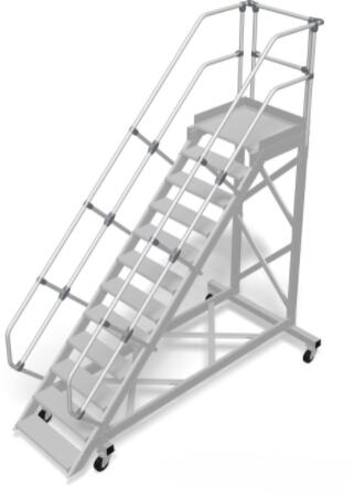 "Robusztus gurítható alumíniumlépcső, biztonságos és mobil munkaeszköz minden területre, az EN ISO 14122 szabványnak megfelelően. + Lépcsőfokok szélessége: 600 – 800 – 1000 mm (bordázott alumínium fokok)+ Lépcsőfokok mélysége: 225 mm 45° dőlésszögnél és 175 mm 60° dőlésszögnél+ Alumínium rácsos/perforált lemez fokok egyeztetés szerint (240 mm fokmélység45