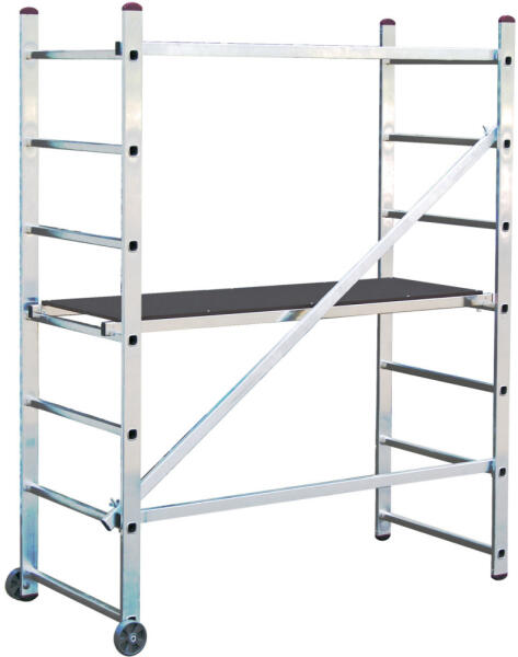 Moduláris állványzat Méretei: 280 x 178 x 80 cm (MxHxSz) Maximális terhelhetőség: 100 kg Kerekek: 10 cm átmérőjű fékezhető Létra fokok közötti méret: 30 cm Anyaga: porszórt acél További információk:Összecsukható szerelőállvány Kompakt, összecsukható, moduláris állványzat ami ideális belső terekhez. Alap magassága 191 cm, ami extra modulokkal melyek mérete 89 cm,