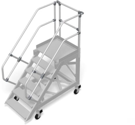 "Robusztus gurítható alumíniumlépcső, biztonságos és mobil munkaeszköz minden területre, az EN ISO 14122 szabványnak megfelelően. + Lépcsőfokok szélessége: 600 – 800 – 1000 mm (bordázott alumínium fokok)+ Lépcsőfokok mélysége: 225 mm 45° dőlésszögnél és 175 mm 60° dőlésszögnél+ Alumínium rácsos/perforált lemez fokok egyeztetés szerint (240 mm fokmélység45