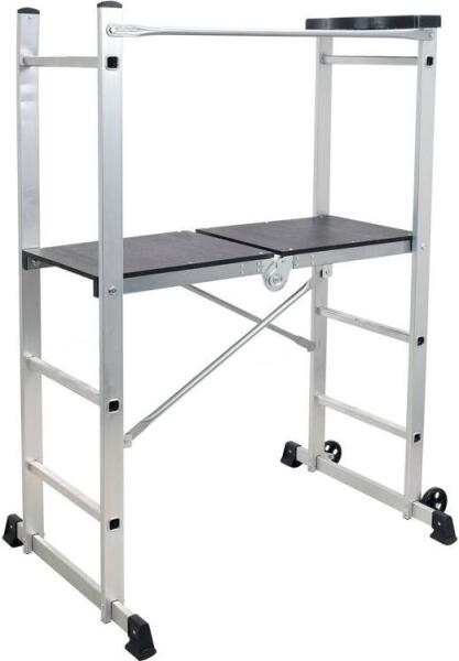 Yato Tools Összecsukható mini állványzat alumínium alapú ötvözetből. munkaasztal előkészített vízálló rétegelt lemezből a felső létrafok felett állvány található a szerszámok vagy festéktartályok biztonságos tárolására állványzat gumi csúszásgátló lábakkal és két kerékkel a könnyű szállítás érdekében széthajtott állványzat méretei: 154 x 113,5 x 8