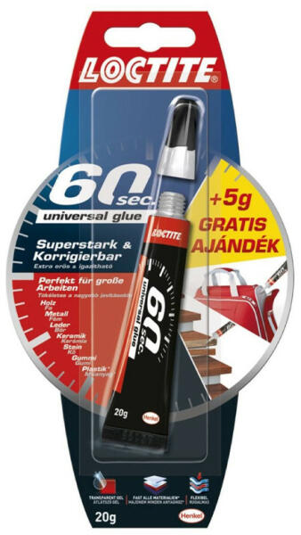 univerzális ragasztó 20g gyors és erős kötés Ha van egy perce - végezzen el nagyobb javításokat is az új Loctite 60 sec. általános ragasztóval. Gyors, erős és újrailleszthető. Tökéletes eredmények csupán 60 mp alatt. Felhasználható: bőr, gumi, fém, porcelán, papír, műanyag Főbb tulajdonságok: Gyors: kb. 60 mp alatt köt Extra erős: több mint 1 kg/cm2 erősségű kö