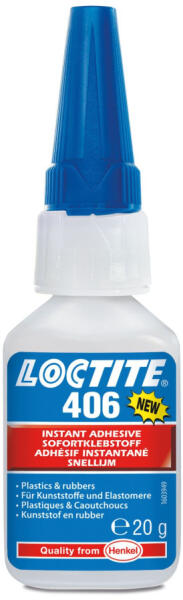 A Loctite 406 egy kis viszkozitású, gyorsan kötő pillanatragasztó, amely ideális a műanyagok és elasztomerek ragasztásához olyan esetekben, ahol nagyon gyors javításra van szükség. Ragasztja a legtöbb műanyagot és gumit, primer (Loctite 770) használatával a PE és PP is ragaszthatóvá válik vele. A Loctite 406 pillanatragasztó kifejezetten műanyagok és gumik gyors ragasztá