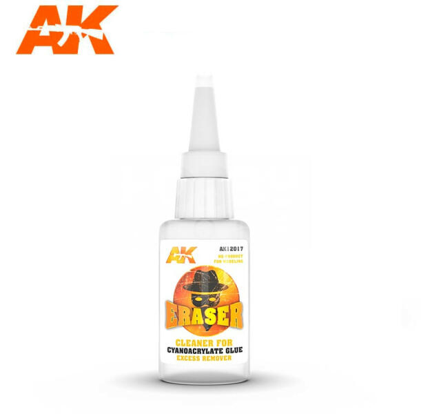 AK-Interactive -ERASER – CLEANER FOR CYANOCRYLATE GLUE EXCESS REMOVER - (Pillanatragsztó eltávolító) 20g AK12017 Lágyítja és eltávolítja a már megkötött cianoakrilát ragasztókat. Hogyan használjuk: * A tisztítandó felületet az ERASER tisztítóba mártott papírtörlővel dörzsölje le. * Még nedves állapotban tisztítsa meg a felületet egy papírtörlővel, hogy eltávolí
