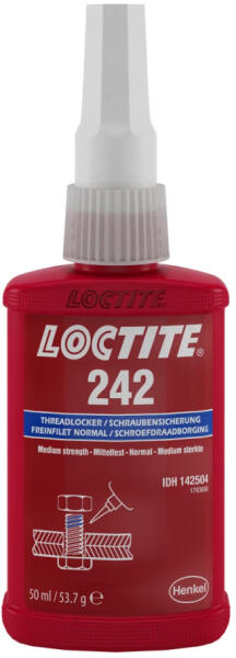 A Loctite 242 egy közepes szilárdságú, közepes viszkozitású, általános felhasználási célú metakrilát csavarrögzítő termék fém menetek rögzítésére M36 méretig. Jellemző rögzítési idők 5, 15 és 20 perc acélon, sárgarézen és rozsdamentes acélon. A Loctite 242 tixotróp tulajdonsága lecsökkenti a termék felvitel utáni elfolyását. A termék olyan menetek rögzí