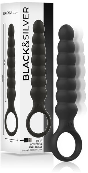 Black & Silver Bob akkumulátoros, vibrációs anál gyöngysor Egymás után növekvő méretű gömbös elemekből álló, anál izgatásra tervezett vibrációs eszköz, mely akár kezdőknek is jó szolgálatot tehet. Váza a nagy méretű, erős kihúzó gyűrűig kissé rugalmas, felülete selymes tapintású szilikon, mely kissé puha. Roppant csendes, közepes intenzitású vibrációs