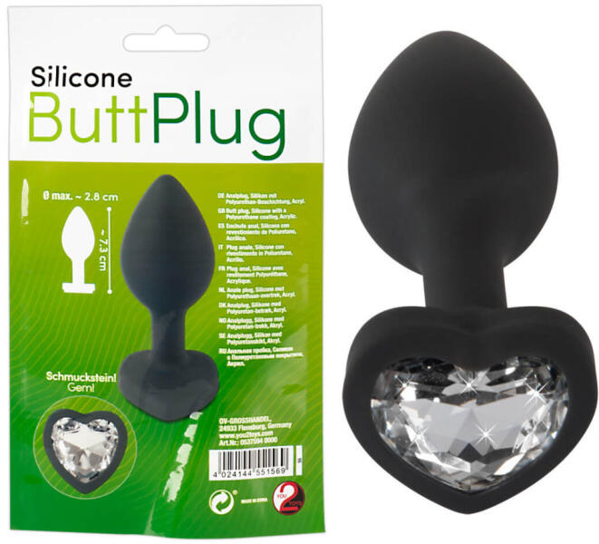 Silicone Butt Plug - fehér köves, szíves anál dildó (fekete) Allergiára hajlamosaknak is ideális, közepes méretű tágító análkúp, csillogó kővel, akár egy gyönyörű popsi ékszer! Miért jó? Magas minőségű, bőrbarát anyag - érzékenyeknek is ideális Olcsó csomagolás, szuper kedvező ár! Bársonyos bevonat és ruganyosság - teljes kényelem Kúpos, elkeskenyedő forma