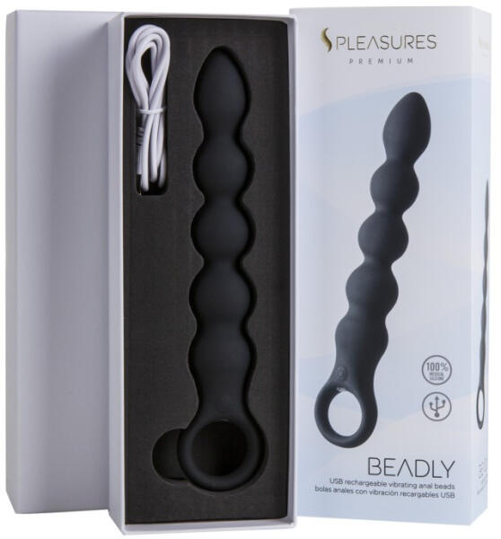 100%-os orvosi minőségű szilikonból készített, sima, selymes felületű, 5 azonos átmérőjű gömbből kialakított, 7 vibrációs és 3 sebességi fokozattal rendelkező, könnyen kezelhető, záróizom tágító, lazító eszköz, biztonságos fogóval. Uniszex, férfiaknak és nőknek egyaránt ajánlott. Tisztítása: minden használat előtt és minden használat után langyos szappan