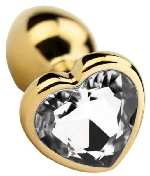 Fém anál dildó, szív formájú, áttetsző kristállyal (arany színű) Fémből készült fenékdugó, szivet formázó talpán áttetsző betéttel. Teljes hossza: 6,7 cm Tojás rész hossza: 4 cm Tojásrész legnagyobb átmérője: 2,7 cm Anyaga: fém Zacskós csomagolás
