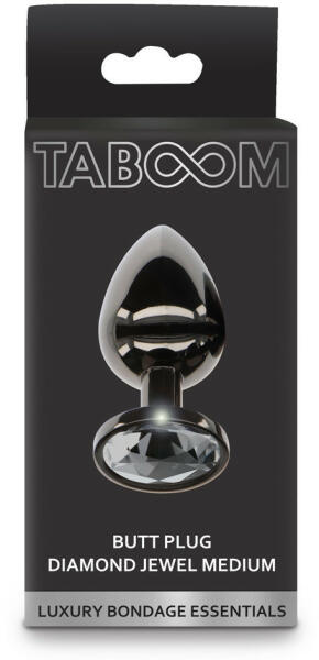 Taboom Luxury fém anál dildó fekete kristállyal (M méret) Elegáns fekete "színű", fényes, metálos csillogású fenékdugó, talpán fekete, műanyagból készült kristályt formázú díszítőelemmel. Teljes hossza: 8,3 cm Tojás rész hossza: 5 cm Tojásrész legnagyobb átmérője: 3,4 cm Tömege: 62 gramm Anyaga: fém, műanyag