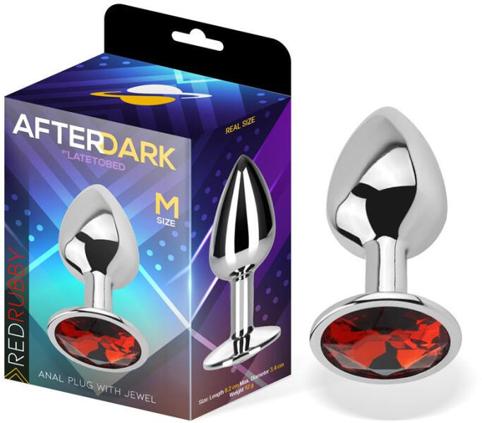 Afterdark análkúp piros kővel - közepes méret Csodás anál ékszer ezüst színben pompázó fényes alumíniumból piros kővel a végén a popószex kedvelőinek. Kúp formában készült izgató, mely kiváló tágító is, miközben kiszélesedő talpa a becsúszást akadályozza meg és bent tartja a kis játékszert, amíg a másik kéjnyílást kényezteted. Mérete miatt kezdőknek i