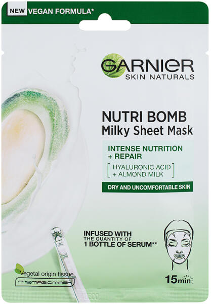Kényeztesd magad a GARNIER első, tejes szérummal átitatott fátyolmaszkjával a bőröd intenzív táplálásáért és szárazságának csökkentéséért, akár 15 perc alatt! Bio mandulatejjel és feltöltő hatású hialuronsavval gazdagítva. *A Moisture Bomb nappali krém 7