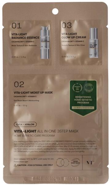 VT Cosmetics - Vita-Light All In One 3Step Mask - 3 lépésből álló arcmaszk Tartalmaz egy koncentrált szérumot, egy fátyolmaszkot és egy krémet az ápolás befejezéseként. A hiperpigmentáció világosítására, a bőrtónus javítására és a bőr intenzív hidratálására szolgál. A termék C-vitamint tartalmaz, amely egészséges ragyogást kölcsönöz és csökkenti az öreged