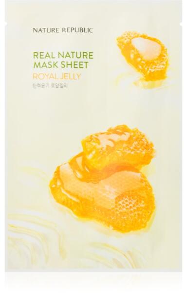 NATURE REPUBLIC Real Nature Royal Jelly Mask Sheet, 23 ml, fátyolmaszkok nőknek, Élvezze a koncentrált szérum és esszencia hatását, de egyúttal a koreai szokások által ihletett gondoskodó rituálénak köszönhetően az ellazulást is. A minőségi NATURE REPUBLIC Real Nature Royal Jelly Mask Sheet fátyolmaszk gondoskodik bőre extra adag ápolásáról, miközben a puha szövet érin