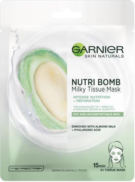 Garnier Skin Naturals Nutribomb Milky Almond Textil Maszk, 28g Mandula tejjel és hialuronsavval dúsított Garnier Nutribomb maszk intenzív táplálást és helyreállítást nyújt a száraz bőr számára. Kényeztesse száraz bőrét az első Garnier maszkkal, amely enyhén texturált szérummal van telítve, amely 15 perc alatt táplálja és helyreállítja a száraz bőrt. 15 perc eltelté