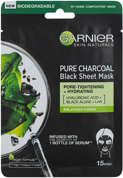 A fekete textil maszk szenet tartalmaz. Feketealga-kivonattal, LHA-val és hialuronsavval gazdagított összetétele segít tisztítani és hidratálni a bőrt a kevésbé látható pórusokért és a bőrfelszín finomításáért, megszépítéséért. Zsíros, tág pórusú bőrre.