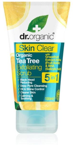 Dr Organic Skin Clear hámlasztó bőrradír 5 az 1-ben, 150 ml- Teafaolaj, grépfrút, fűzfakéreg-és kamillakivonatának köszönethetően mélytisztító hatású hámlasztó bőrradír - Vulkanikus láva szemcsék kombinációjával élénkíti, nyugtatja a bőrt és csökkenti a már kialakult mitesszerek számát - Gyümölcssav és szalicilsav tartalma serkenti a sejtmegújulást és az