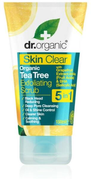 ArcápolásDr Organic Skin Clear hámlasztó bőrradír 5 az 1-ben, 150 ml- Teafaolaj, grépfrút, fűzfakéreg-és kamillakivonatának köszönethetően mélytisztító hatású hámlasztó bőrradír - Vulkanikus láva szemcsék kombinációjával élénkíti, nyugtatja a bőrt és csökkenti a már kialakult mitesszerek számát - Gyümölcssav és szalicilsav tartalma serkenti a sejtmegújulá