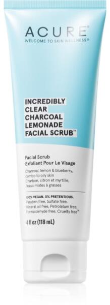 ACURE Incredibly Clear Charcoal Lemonade, 118 ml, Arcpeeling nőknek, Nem kell szépségszalonba mennie a hatékony hámlasztásért, hogy megelőzze a bőrhibákat. A kiváló ACURE Incredibly Clear Charcoal Lemonade arcradír gondoskodik róla otthona kényelmében. Nemcsak eltávolítja az elhalt hámsejteket, amelyek hajlamosak eltömíteni a pórusokat, valamint mitesszereket, fénytelen és