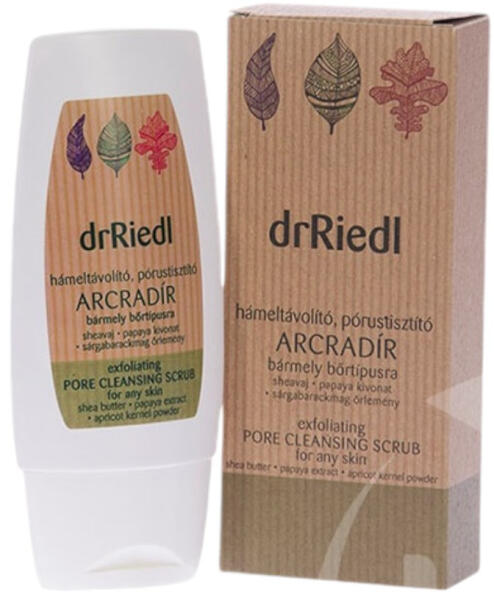 Dr Riedl hámeltávolító, pórustisztító arcradír 100 ml Hatóanyagok: papaya kivonat, sárgabarackmag őrlemény, sheavaj Bőrtípus: minden bőrtípusra Növényi kivonatokban gazdag készítmény, amely kíméletesen szabadítja meg bőröd az elhalt hámsejtektől és a pórusokban lerakódott mindennapi szennyeződésektől. A papaya kivonat enzimes hámoldó hatása és a finom szemcsé
