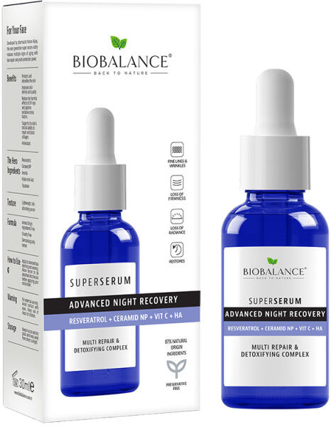 Biobalance szuperszérum arcra éjszakai regeneráló 30 ml Könnyed, gyorsan beszívódó szérum, emulzió. Dermatológiailag tesztelt. Kenan Alpay gyógyszerész által kifejlesztett új generációs szuperszérum, mely láthatóan csökkenti az öregedés jeleit, gyors regenerálódást és védelmet biztosít a bőrnek. 88%-ban természetes eredetű összetevőket tartalmaz. Védi a bőrt Hid