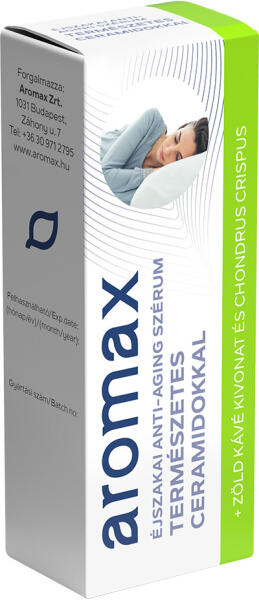 Aromax szérum éjszakai anti-aging 20 ml A bőr természetes éjszakai megújulását támogató arcszérum. Támogatja a bőr egészséges lipidrétegét, természetes ceramidokkal, lipidekkel, és szterolokkal. AvenaPlex, zöldkávé, Oligogeline, ír vörösmoszat hatóanyagokkal, vegán termék, nem tesztelünk állatokon.