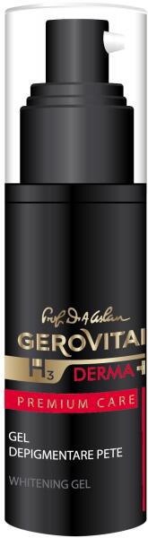 Gerovital H3 Derma+ Premium Care , 30 ml A gélt azoknak szánjuk, akiknek életkortól függetlenül pigmentfoltjaik, színegyenetlenségük, szeplőik vannak. Hatékony összetevőket tartalmaz, amelyek szinergikus hatással vannak a bőr elszíneződésére: tiszta resveratrol, komplex hatású és Arbutin, a tirozináz enzim gátlója- a pigmentáció megjelenéséért felelős enzim.