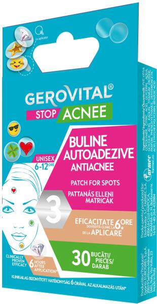 Gerovital Stop Acnee Pattanás elleni tapasz pöttyök, 30 db Az öntapadós pattanás elleni tapasz a pattanások elfedésére vagy a pattanások utáni jelek elfedésére ideális. Álcázza és elhalványítja a pattanásos bőrhibákat. Véd a por és a szennyeződések ellen. Bizonyítottan hatékony in vivo vizsgálatokban a látható pattanások csökkentésére. Alaposan tisztítsa meg és