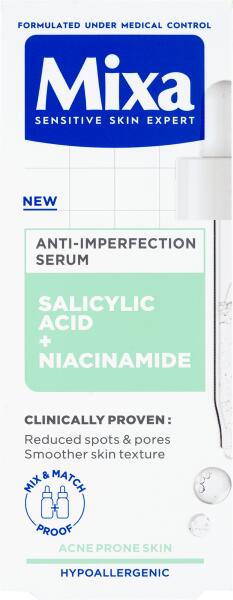 Mixa tökéletlenségek elleni szérum egymást kiegészítő aktív összetevőkkel gazdagítva: szalicilsav és niacinamid. A szalicilsav segít csökkenteni a felesleges faggyút, összehúzni a pórusokat és minimalizálni a pattanások megjelenését. A niacinamid segít csökkenteni a bőrhibákat és enyhíti a kapcsolódó diszkomfort-érzetet.